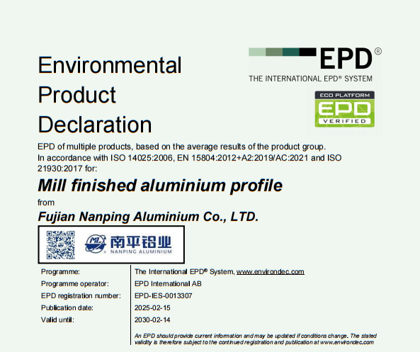 南平鋁業(yè)建筑鋁型材全系主導產(chǎn)品獲國際EPD認證